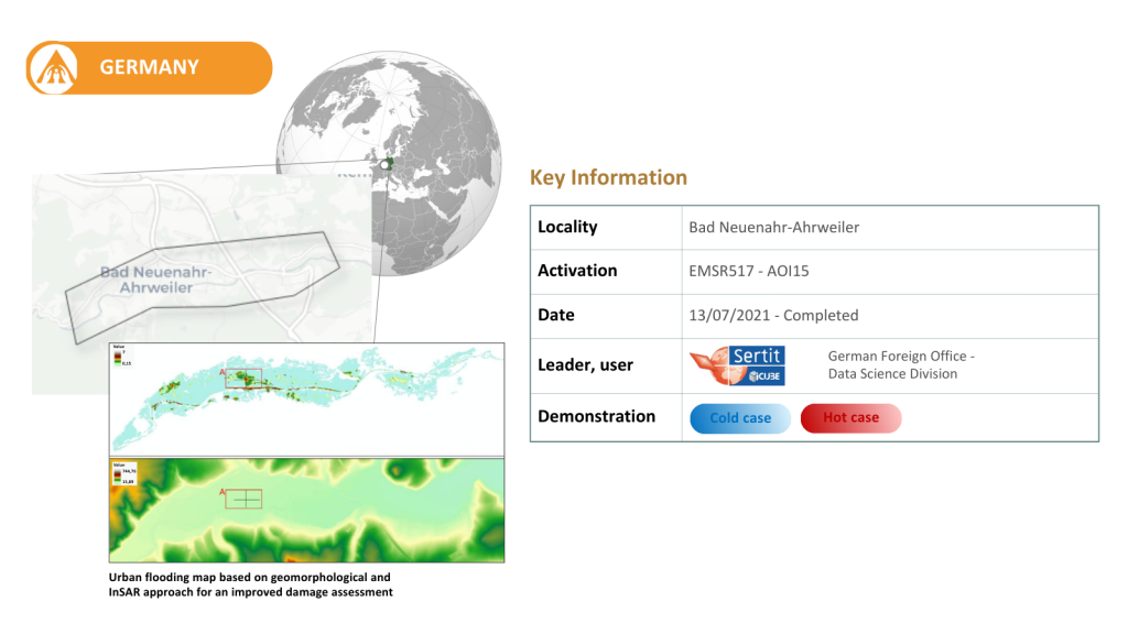 In total, this event has caused more than 200 fatalities in Germany and Belgium, and the CEMS On-Demand Mapping team has been activated twice to monitor the consequences of the event (EMSR517 and EMSR518). Bad Neuenahr-Ahrweiler was Germany’s hardest-hit city, with an estimated 117 death toll.