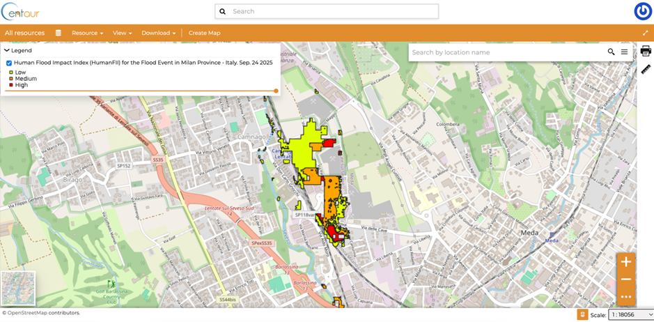 Example from the CENTAUR platform illustrating the application of the Human Flood Impact Index (HumanFII) during a flood event in Milan province in September 2025.