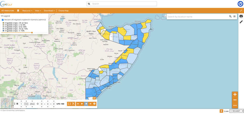 Example from the CENTAUR platform illustrating the percentage of irrigated cropland for the Somalia use case.