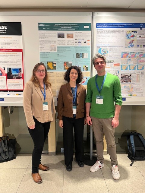 CENTAUR representatives presenting our research poster at the EU Science for Preparedness Conference. From left to right Jessica Jeune (ECMWF), Matilde Oliveti (Ithaca), Emanuele Cassin (Ithaca).